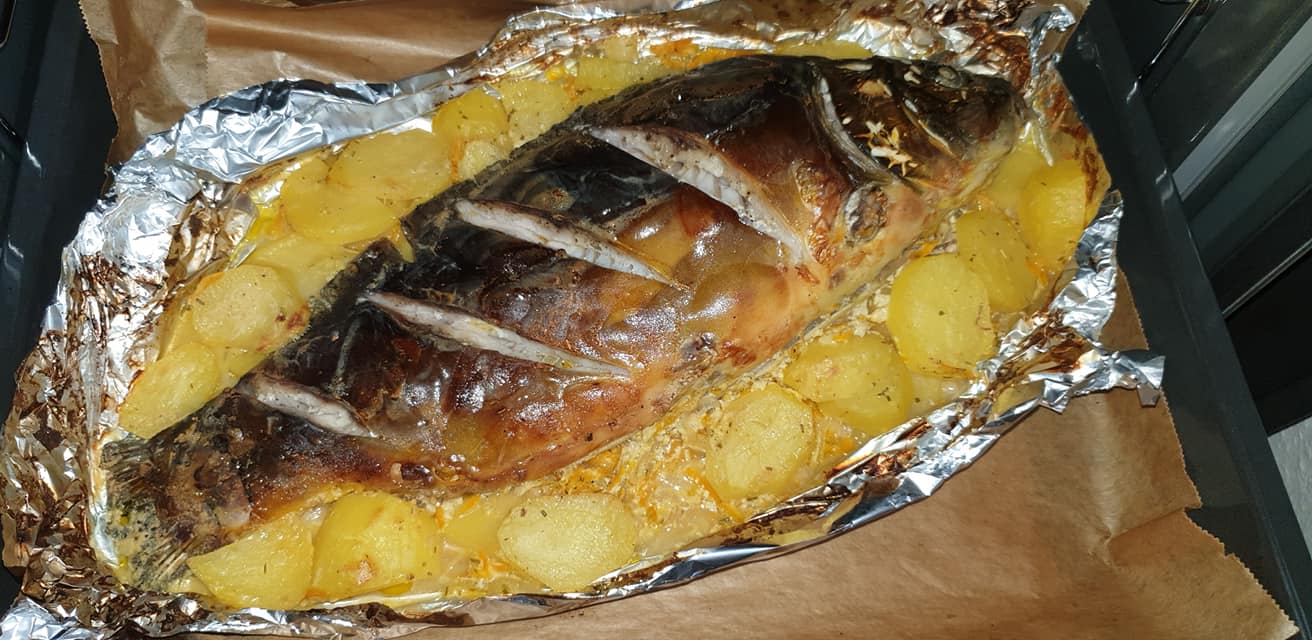 Оборачиваем форму в фольгу и запекаем при 200 С в течение часа. За 20 минут до готовности снимаем фольгу, смазываем карпа сливочным маслом и допекаем.