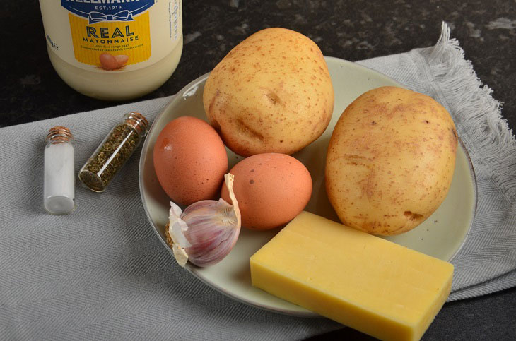 Для приготовления закуски нужно взять крупный картофель без повреждений. Твердый сыр подойдет любой – можно взять продукт с разными добавками, например, с зеленью, орехами или пряностями. Важно, чтобы он хорошо плавился. А можно и плавленый сыр использовать – он имеет более широкий спектр разновидностей, например, с ветчиной, грибами или креветками.