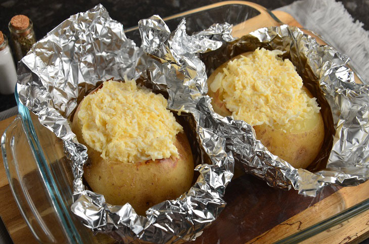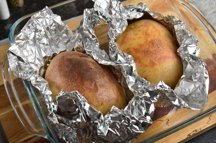 1. Картофель заверните в кусочки фольги и отправьте в разогретый до 180 градусов духовой шкаф. Запекайте около 45 минут, все зависит от духовки и свойств картофеля. Если картофель очень крахмалистый, то возможно, запекать придется дольше.