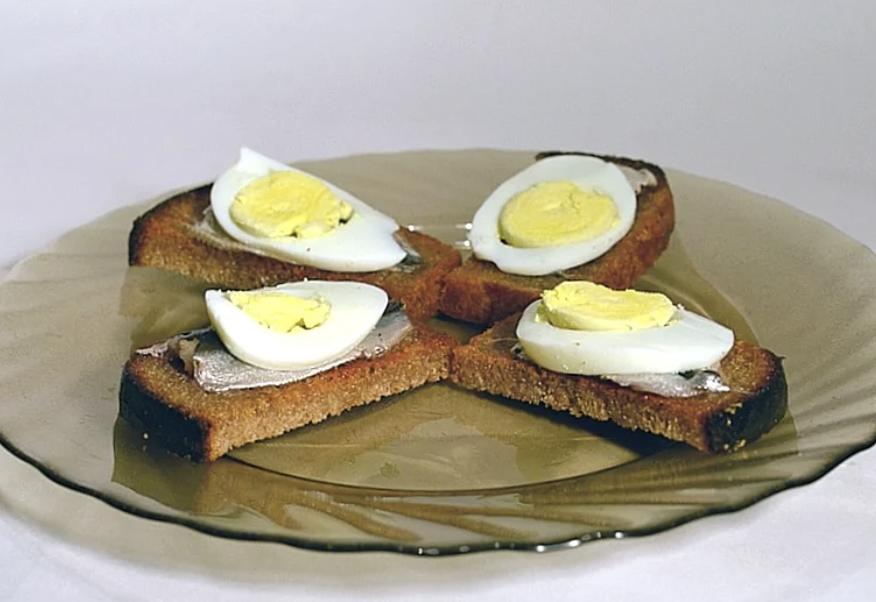 Это «яство» предлагалось в качестве обязательного дополнения к рюмке водки. Самый дешевый сорт мелкой рыбешки клали на ломоть черного хлеба и украшали веткой зелени и половинкой сваренного вкрутую яйца. Этот кулинарный дуэт предлагался в закусочных и привокзальных буфетах.