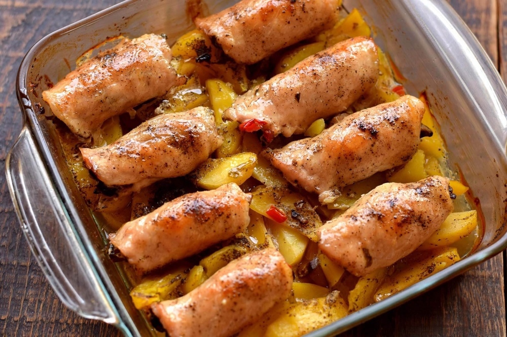 Сверху на картофель выкладываем мясные рулеты.