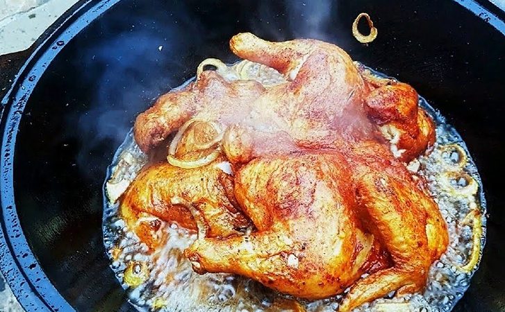 Разогреваем казан с маслом и опускаем цыпленка. Жарим до появления аппетитной хрустящей корочки.