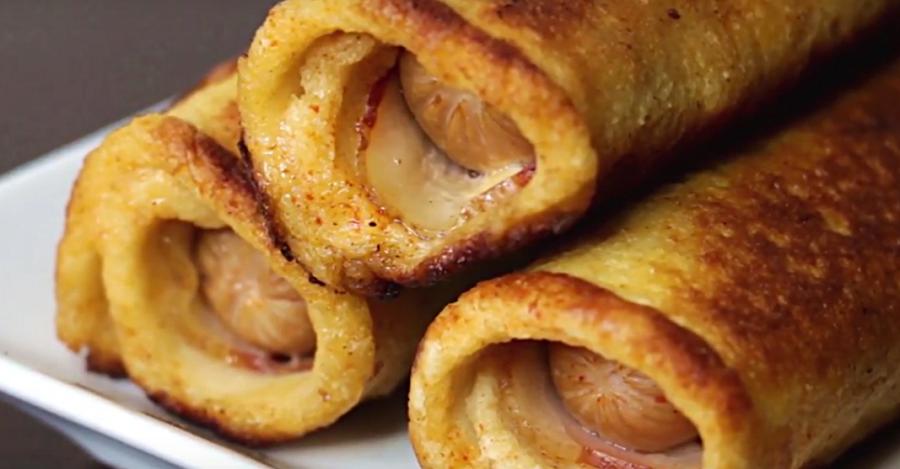 Растапливаем в сковороде сливочное масло, окунаем рулетик в яичную смесь и обжариваем с двух сторон до золотистого цвета.