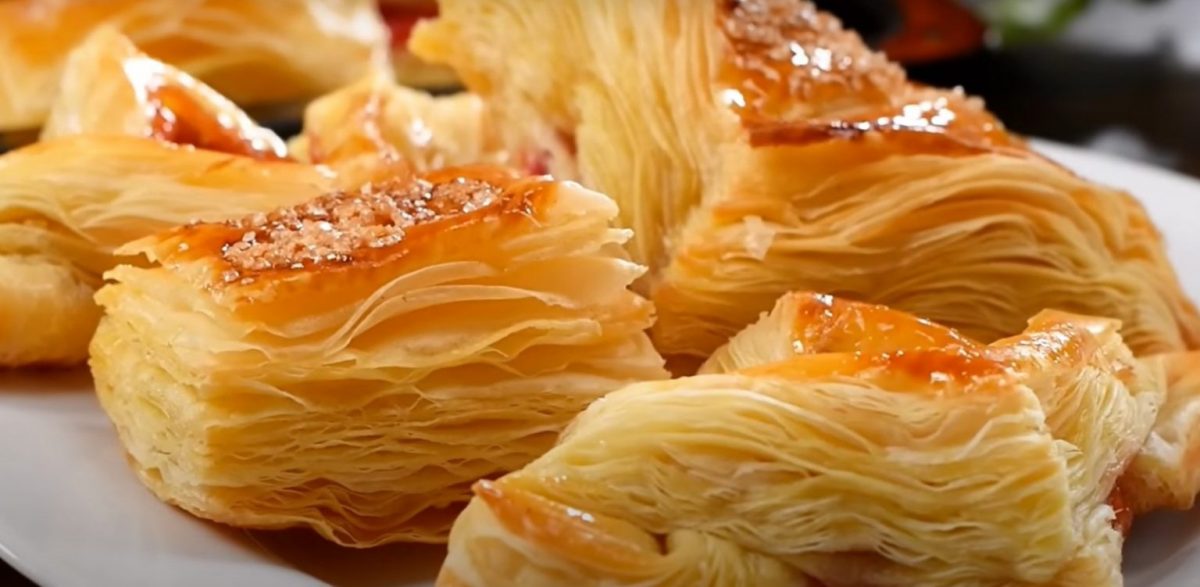 Раскатываем квадрат 20х20 см и отрезаем ножом неровные края. Делим пласт на 4 квадрата и выкладываем в середину джем или варенье по вкусу. Запечатываем начинку и кладем на противень, застеленный пергаментом.