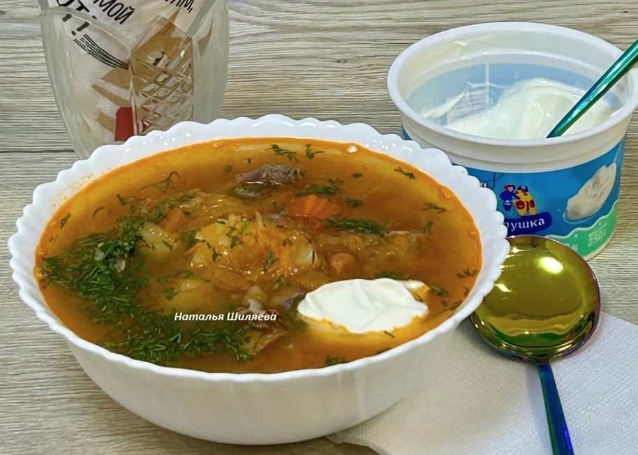- Промываем консервированную фасоль (или используем заранее приготовленную) и добавляем в суп. Когда картофель станет мягким, кладём тушёную капусту. Для аромата можно добавить лавровый лист и перец горошком.