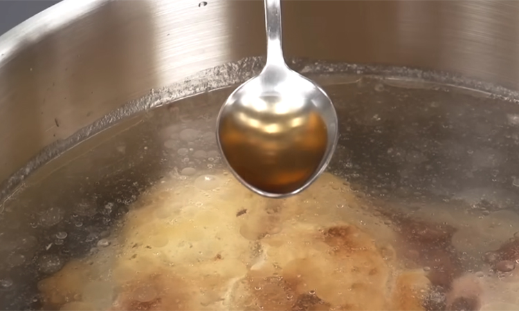 Доведите воду до кипения, снимите пену и убавьте огонь до минимума. Прикрыв крышкой с небольшим зазором, варите кости 12 часов. По мере выкипания жидкости добавляйте горячую воду.