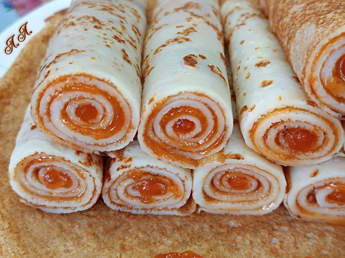 - Готовые блины разрежьте пополам, смажьте повидлом или джемом и сверните в трубочки.