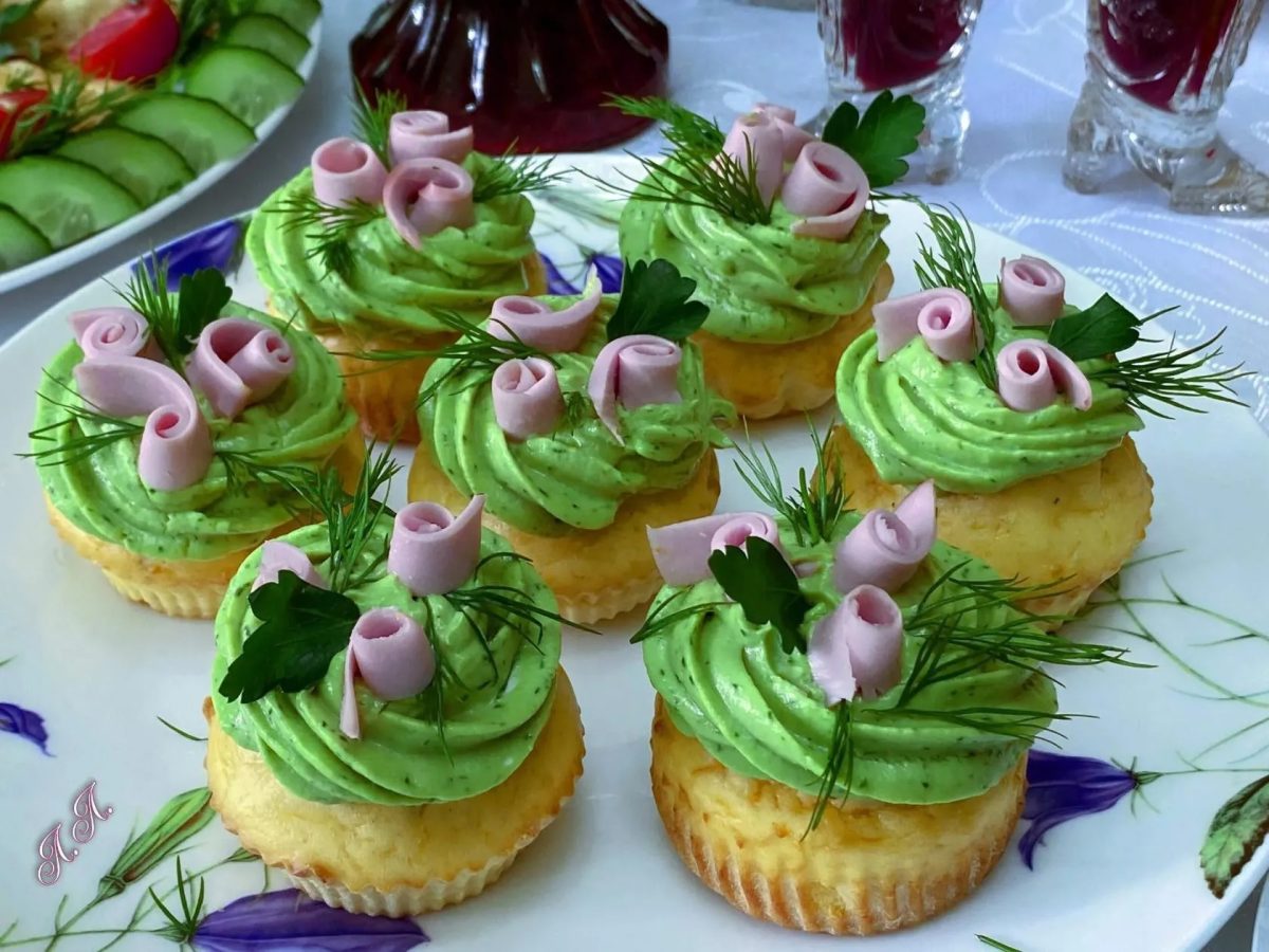 Полностью остывшие кексы украсьте кремом, «розочками» из ветчины и зеленью.