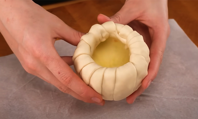 Поставьте каждое яблоко на лист слоеного теста, нарежьте тесто полосками и заверните ими яблоко крест-накрест.
