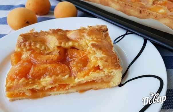 - Раскатайте большую часть и выложите в форму, формируя бортики. Сверху равномерно распределите абрикосовый джем.