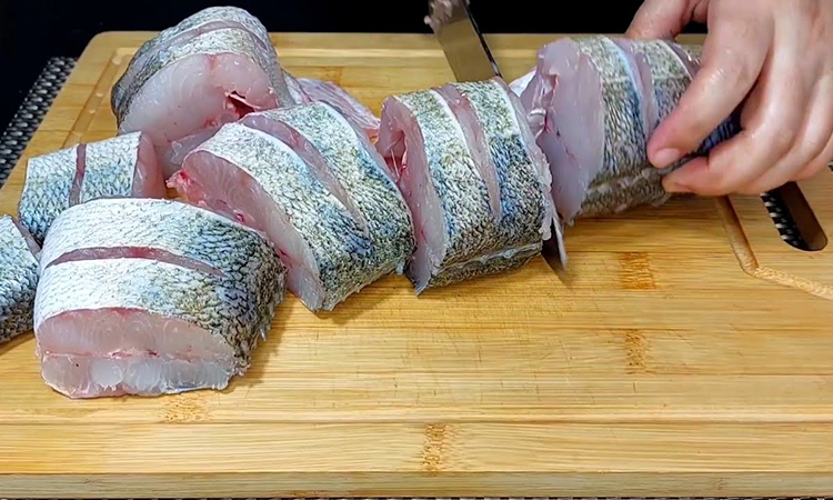 Подготовьте рыбу: очистите, удалите хребет и крупные кости, оставьте кожу. Нарежьте на порционные куски. Посолите и дайте постоять 10–15 минут.