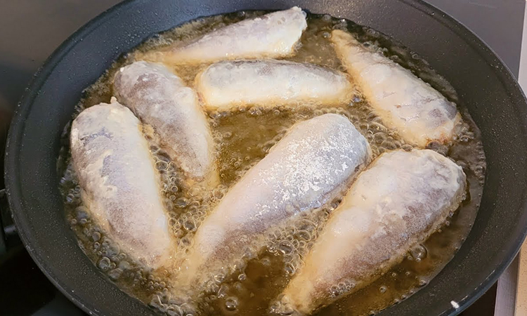 Перед тем как выложить рыбу в сковороду, быстро окуните каждый кусок в воду. Сразу же помещайте в горячее масло.