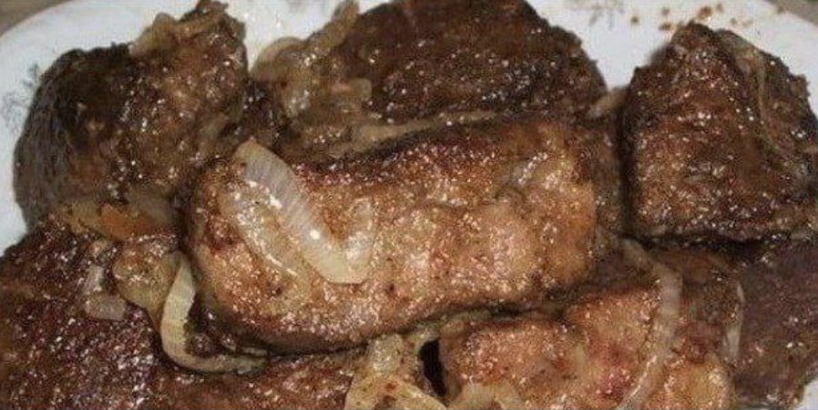 Выложи в эту смесь кусочки печени и поставь в холодильник на 2 часа (можно оставить на ночь). - Нарежь луковицу полукольцами и обжарь в растительном масле до золотистого цвета. Переложи на тарелку.