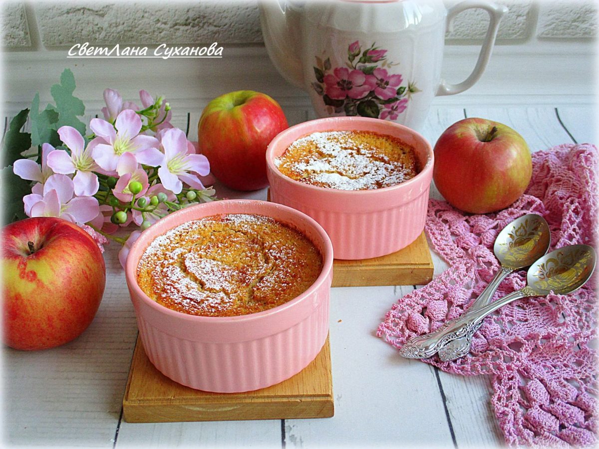 Выпекайте в разогретой до 190 °C духовке около 30 минут. Суфле заметно поднимется, а затем немного осядет при остывании — это нормально. - Посыпьте остывшее суфле сахарной пудрой. Подавайте охлаждённым — особенно вкусно со сметаной или несладким йогуртом.