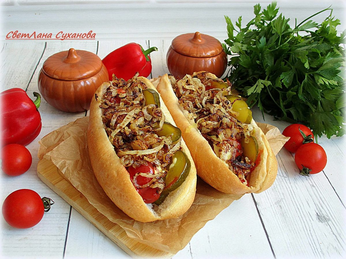 - Разрежьте булочки вдоль. На дно выложите огурцы, затем — обжаренную сосиску. Сверху добавьте немного горчицы и кетчупа, а финальный штрих — хрустящий жареный лук.