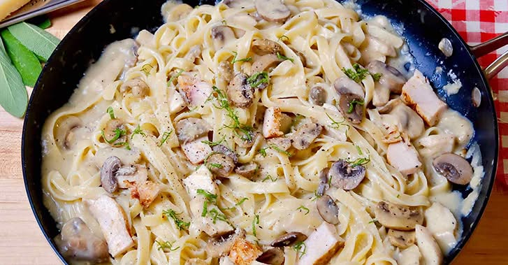 Основу рецепта составляет классический Альфредо-соус, который прекрасно сочетается с кусочками курицы, грибами и пастой. Блюдо получается насыщенным, бархатистым и по-настоящему ресторанным на вкус.
