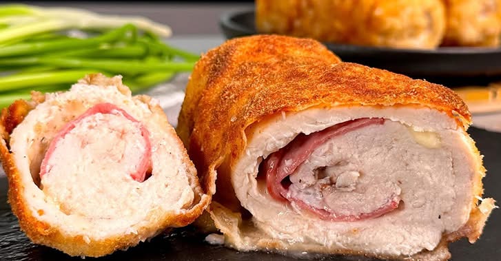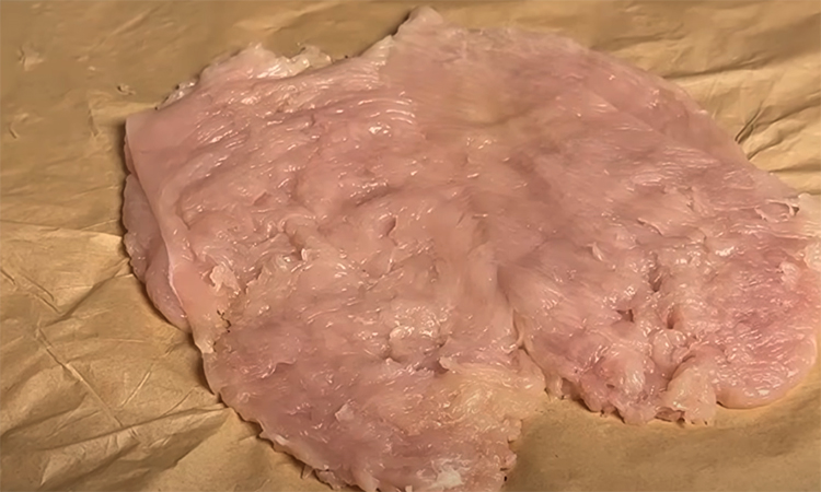 Удалите малое филе и хрящи. В толстой части сделайте надрез, не прорезая до конца, и раскройте «книжкой». Накройте пленкой или пергаментом и аккуратно отбейте до одинаковой толщины. Посолите и поперчите с обеих сторон.