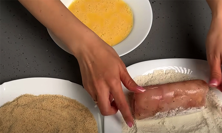Подготовьте три миски: с мукой, взбитыми яйцами и сухарями. Рулетики обваляйте поочередно в муке, яйце и сухарях.