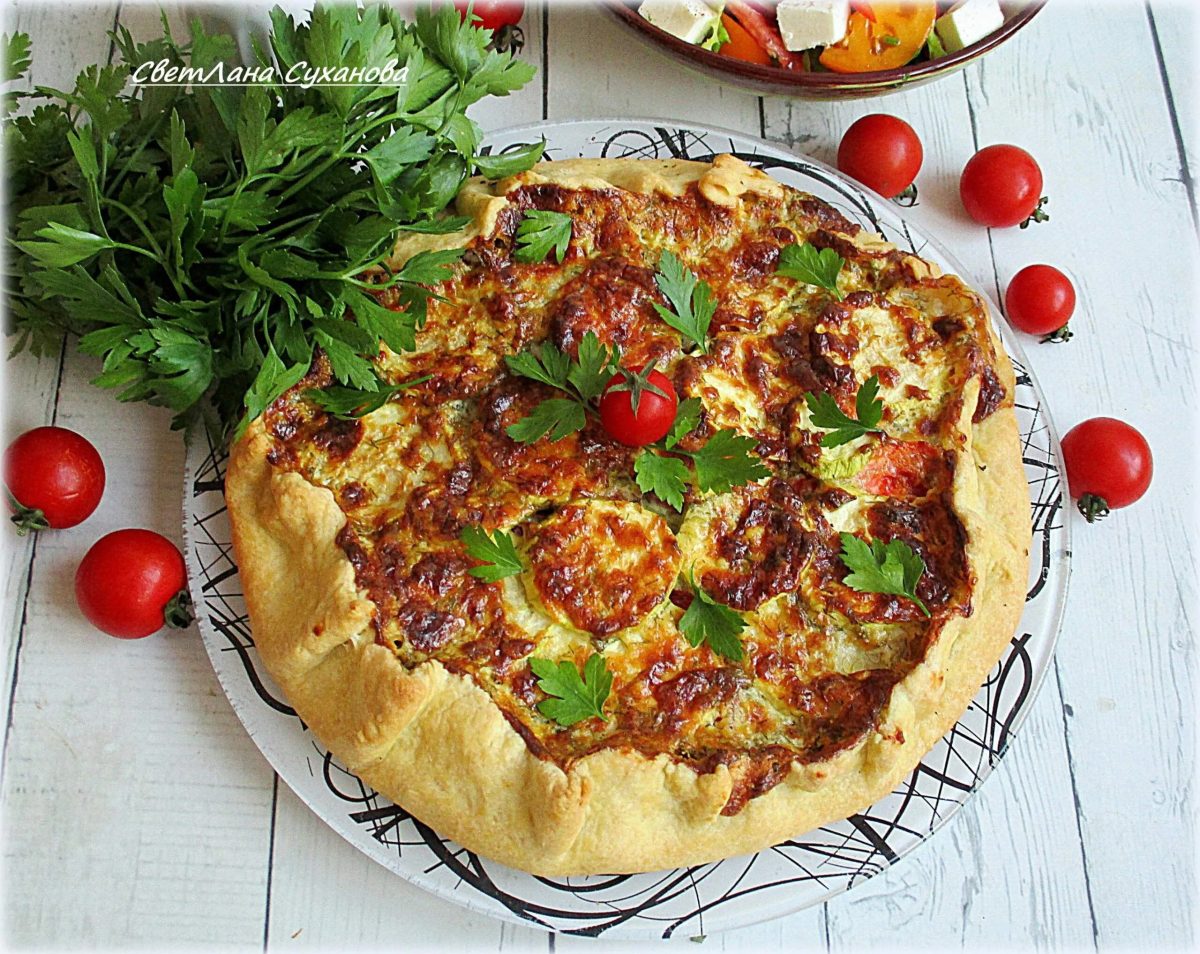 - В центр круга выложите половину кабачков, отступив от края 5 см.