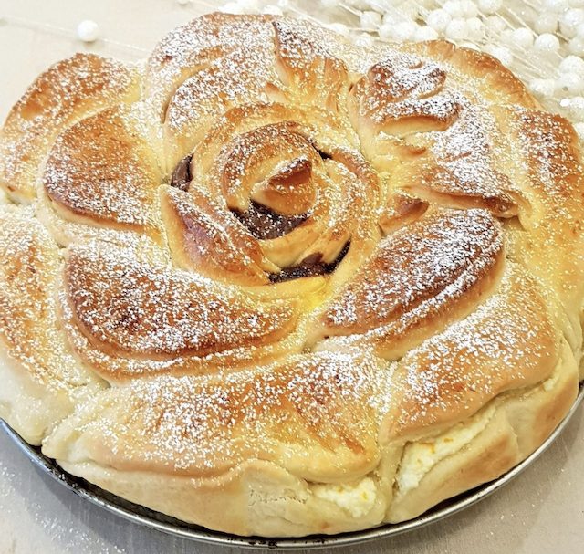 - Полученные «вареники» уложите в форму для выпечки по кругу — от края к центру, создавая узор в виде розы.