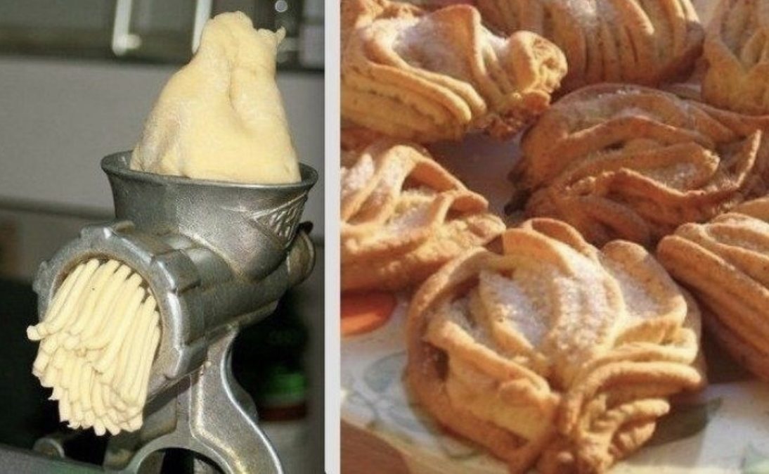 5. Разогрейте духовку до 200 °C. Подготовьте мясорубку — именно через неё тесто будет формироваться в классические «цветочки». Противень застелите пергаментом или слегка присыпьте мукой.