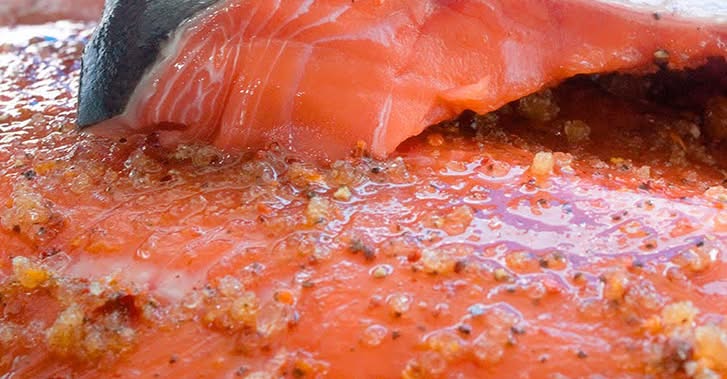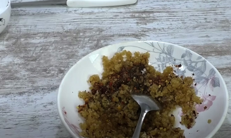 Сначала готовим посолочную смесь. В сковороде смешиваем соль и сахар, обжариваем до образования карамели. После этого даём смеси остыть и перемалываем её в блендере до однородной консистенции.