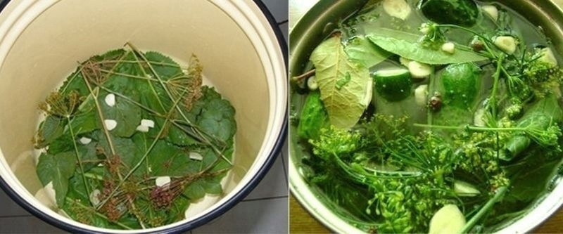 На дно банки или кастрюли выложи дубовые листья, часть укропа, хрена, смородины и вишни, а также половину чеснока, порезанного на кусочки. Плотно уложи огурцы, сверху покрой оставшимися листьями, добавь перец и лавровый лист. Заверши укладку оставшимися огурцами и зеленью.