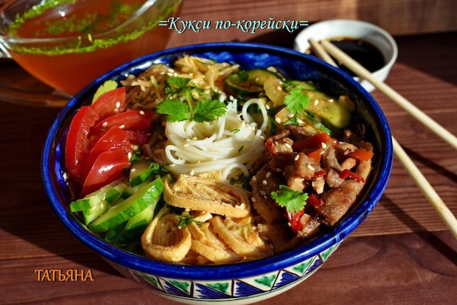 Кукси — это традиционное корейское блюдо,. Оно представляет собой холодную лапшу, подаваемую с мясом, разнообразными острыми овощными салатами, яичной соломкой и особым охлаждённым кисло-сладким бульоном — мури. Это блюдо идеально для жарких дней, но также может подаваться в тёплом виде.
